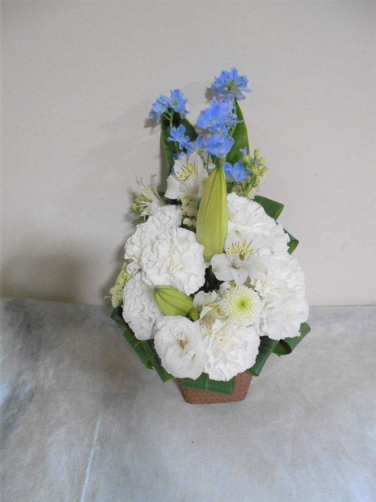お悔やみ お供えの花 供花 (ホワイトにブルー系の挿し色を添えたバスケットアレンジ)