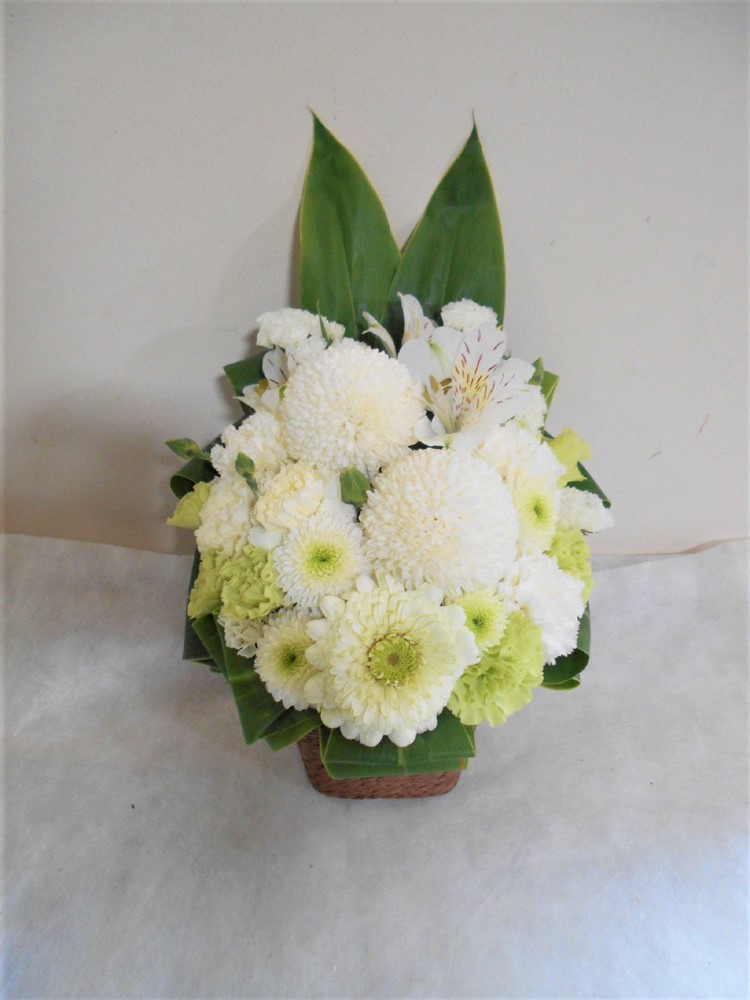 お悔やみ お供えの花 供花 (ホワイト&グリーンでまとめたバスケットアレンジ)