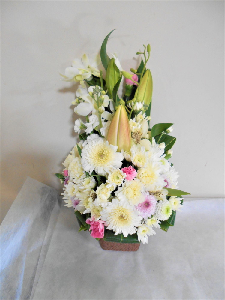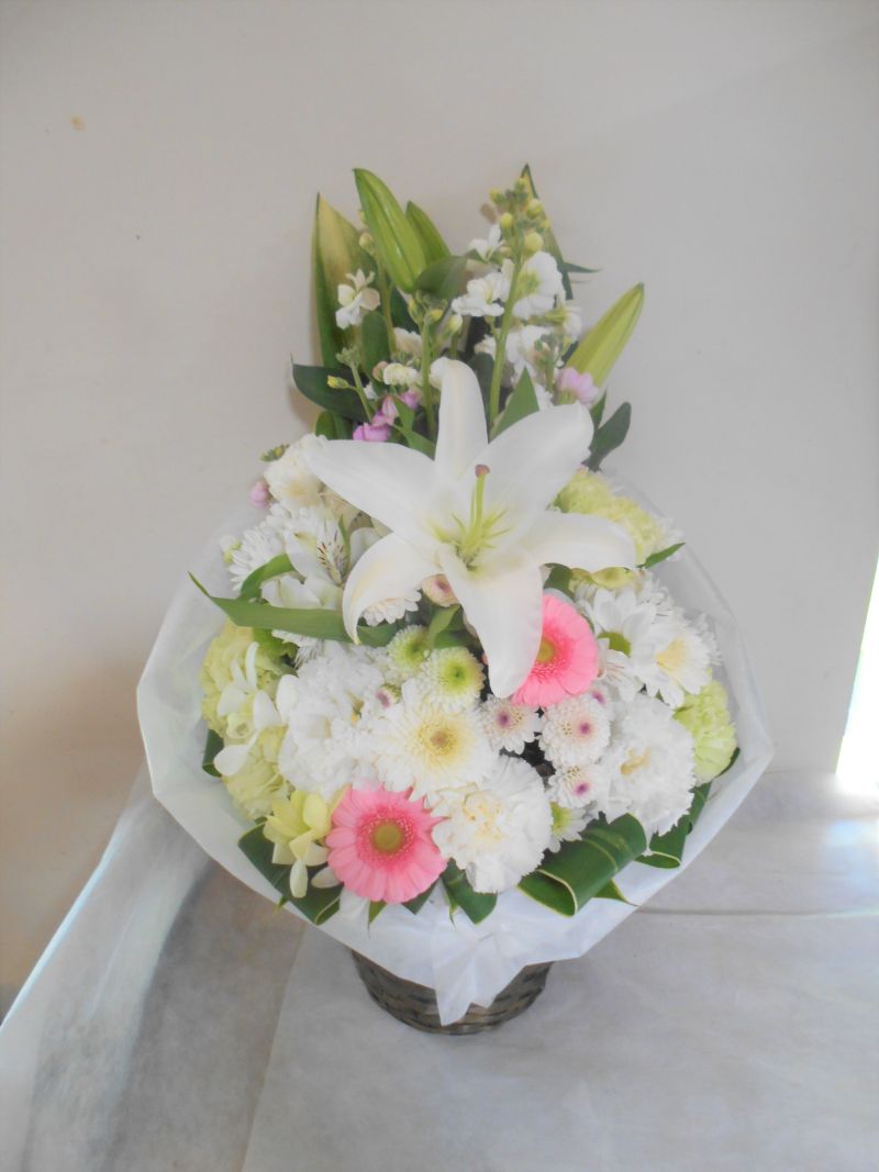 お悔やみ お供えの花 供花 (白ユリをメインにホワイト&ピンクでまとめたバスケットアレンジ)