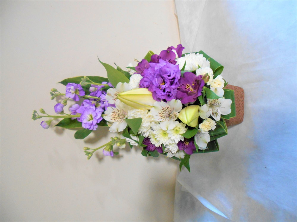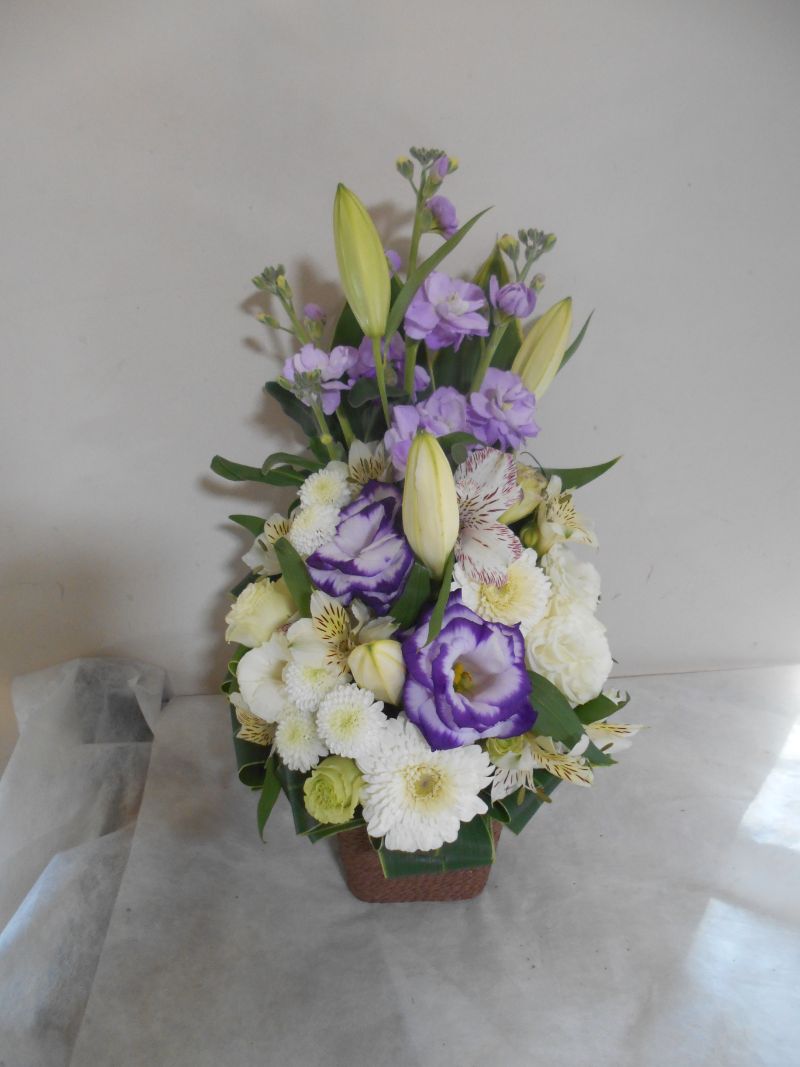 お悔やみ お供えの花 供花 (白基調でユリと紫系のお花をあしらったバスケットアレンジ)