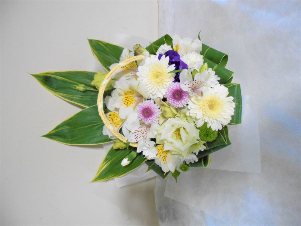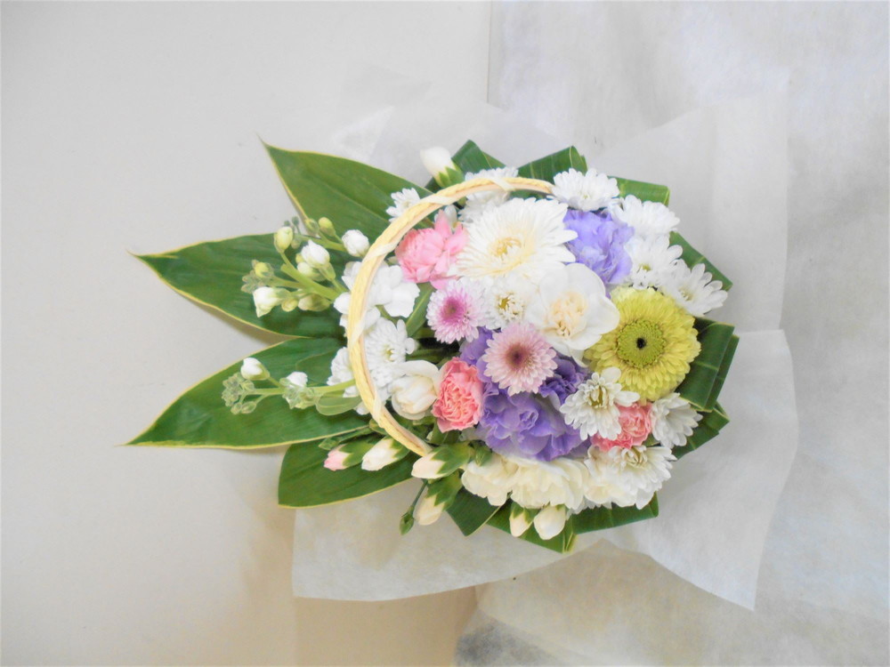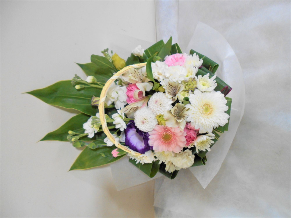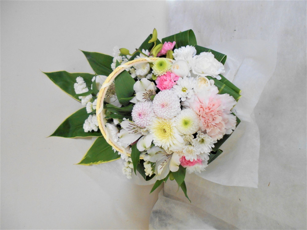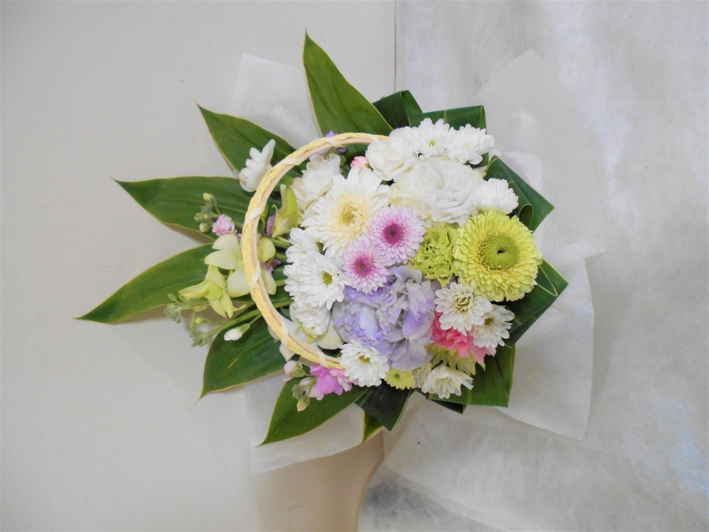 お悔やみ お供えの花 供花 (ホワイト&淡色カラーの手付きバスケットアレンジ)