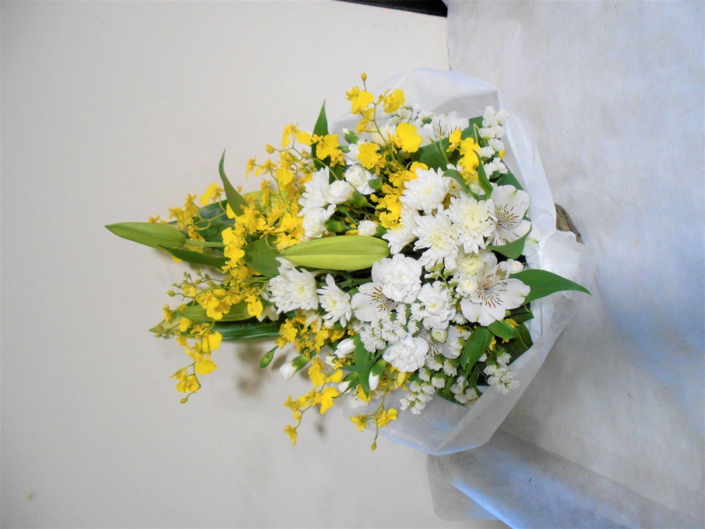 お悔やみ お供えの花 供花 (白ユリをメインに黄色の洋蘭をあしらったバスケットアレンジ)
