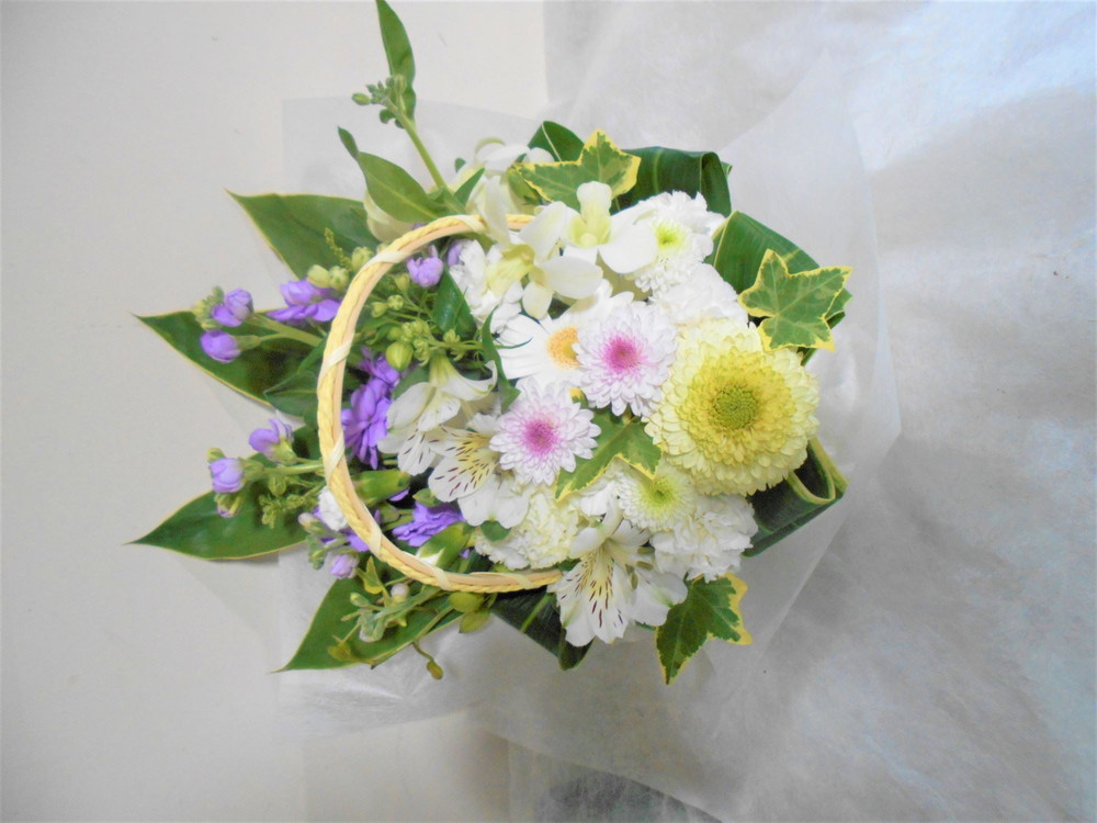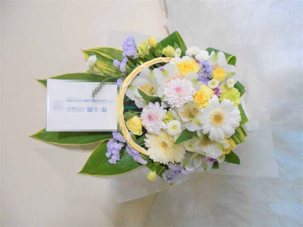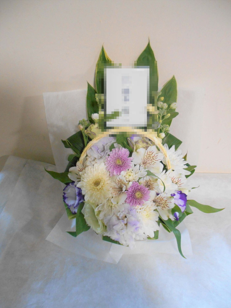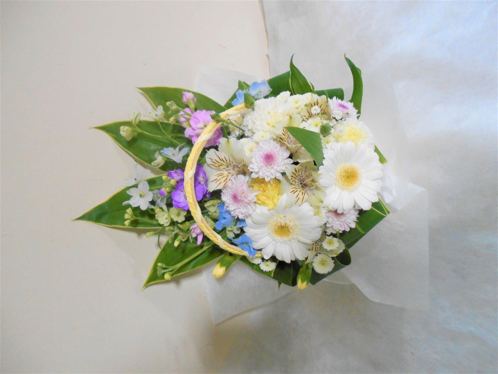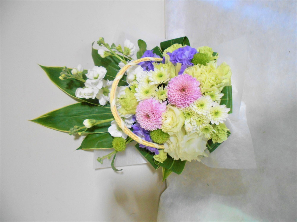 お悔やみ お供えの花 供花 (ホワイト&淡色カラーの手付きバスケットアレンジ)