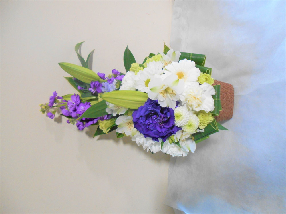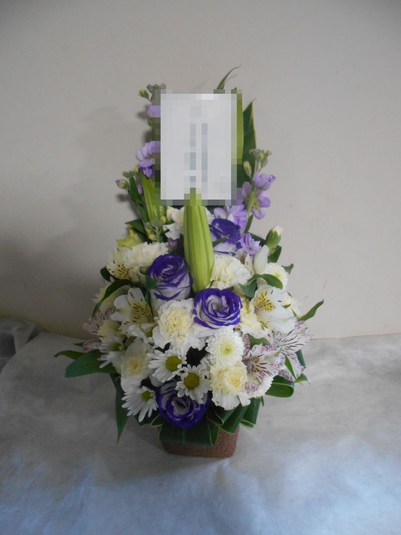 【白系】お悔やみ お供えの花 供花 (白基調でユリと紫系のお花をあしらったバスケットアレンジ)