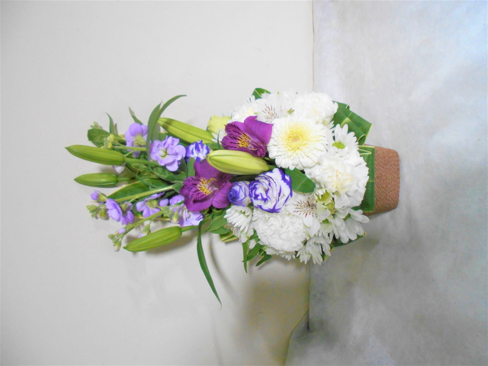 お悔やみ お供えの花 供花 (白基調でユリと紫系のお花をあしらったバスケットアレンジ)