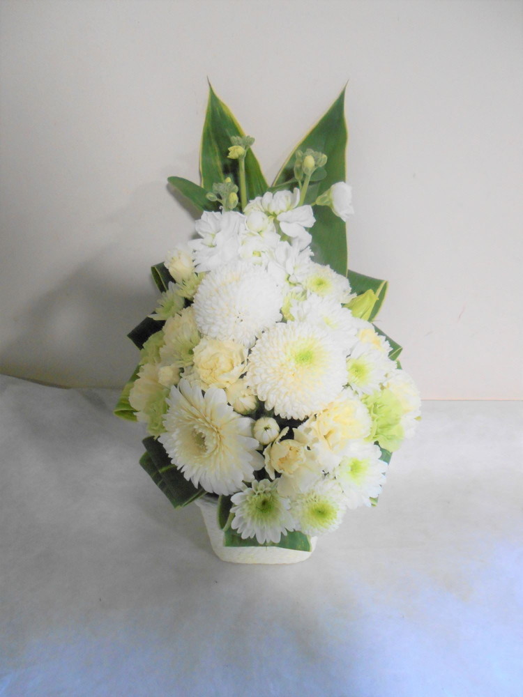 お悔やみ お供えの花 供花 (ホワイト&グリーンでまとめたバスケットアレンジ)