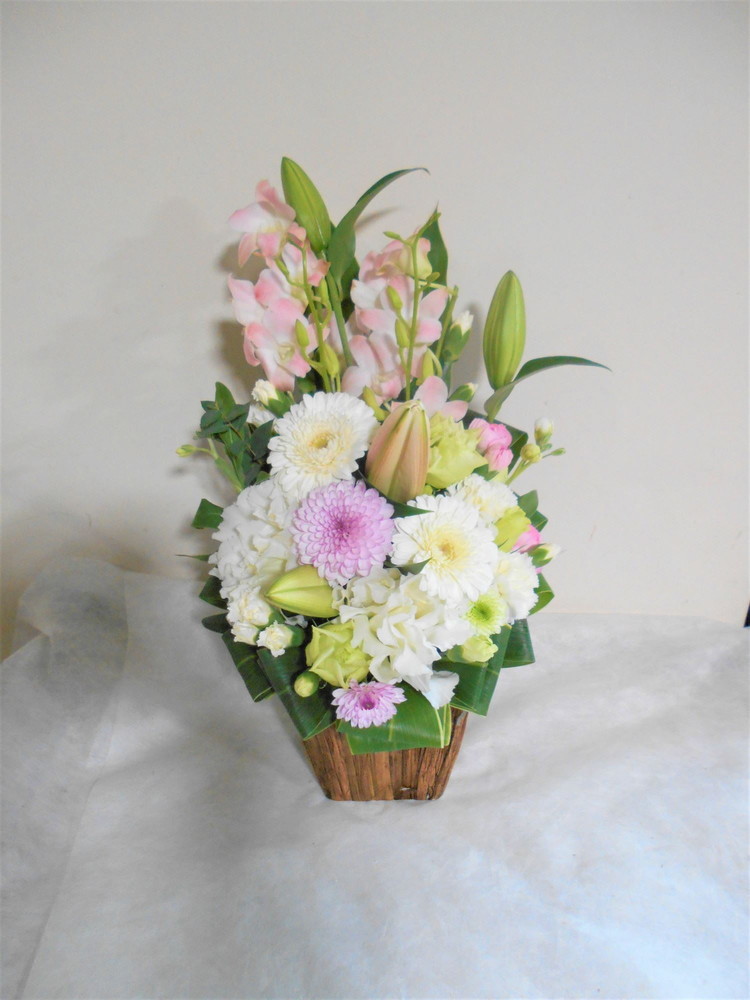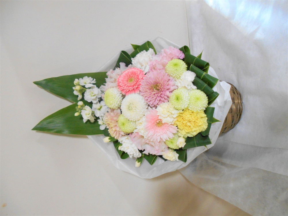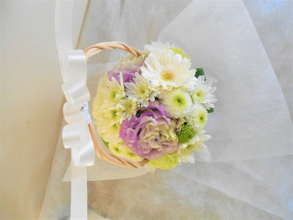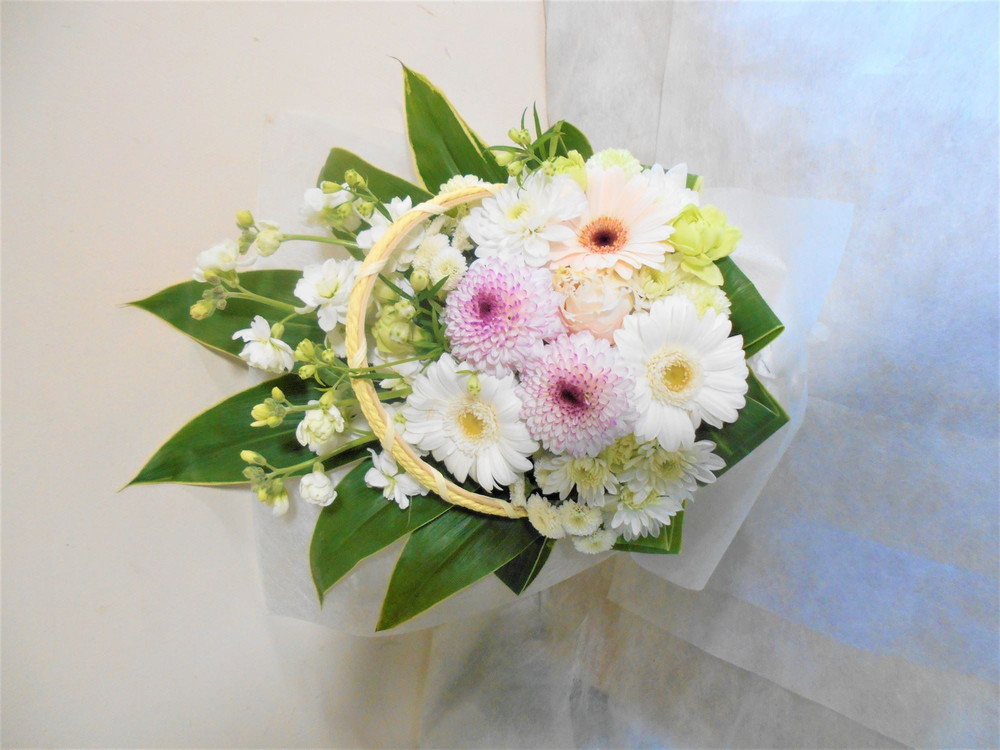 お悔やみ お供えの花 供花 (ホワイト&淡色カラーの手付きバスケットアレンジ)