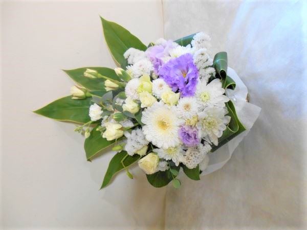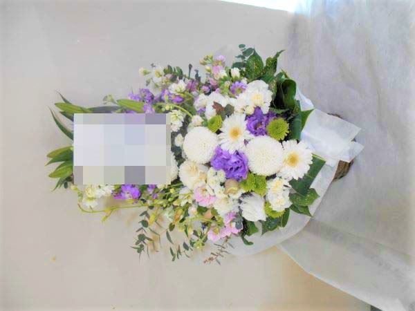 お悔やみ お供えの花 供花 (ホワイト&薄紫系でまとめた手付きのバスケットアレンジ)