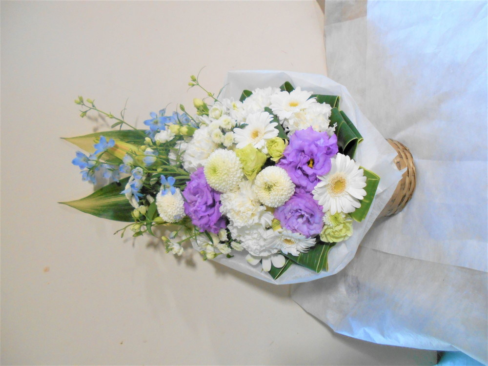 お悔やみ お供えの花 供花 (白基調に青系挿し色をそえたバスケットアレンジ)