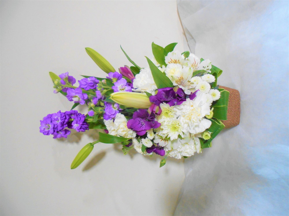 お悔やみ お供えの花 供花 (白基調でユリと紫系のお花をあしらったバスケットアレンジ)