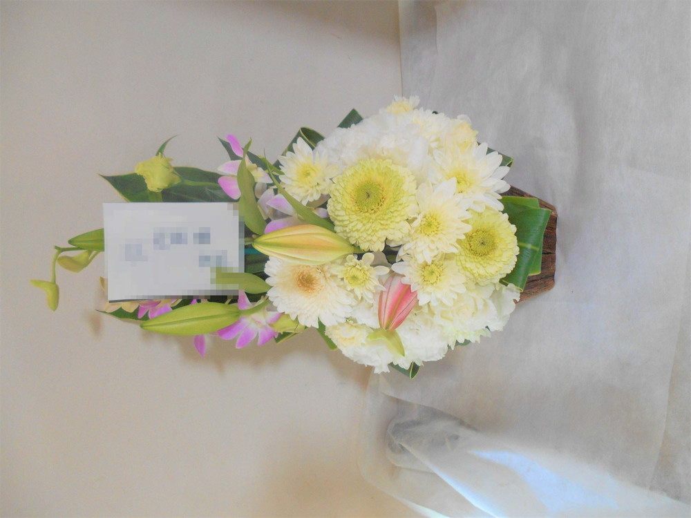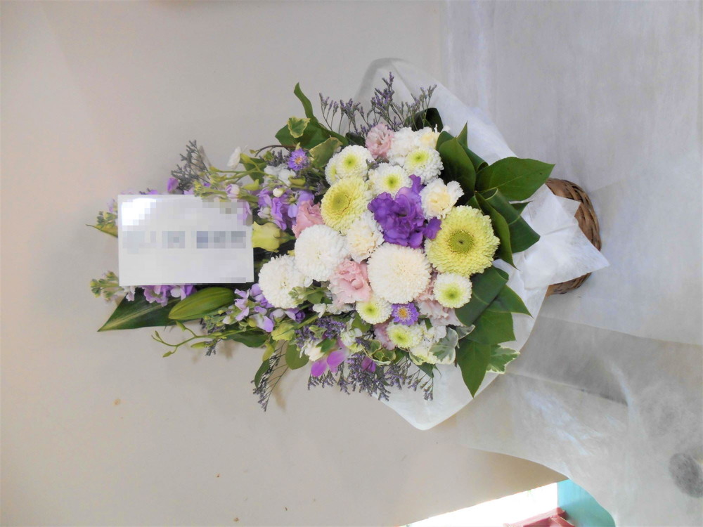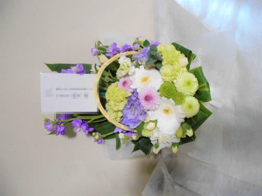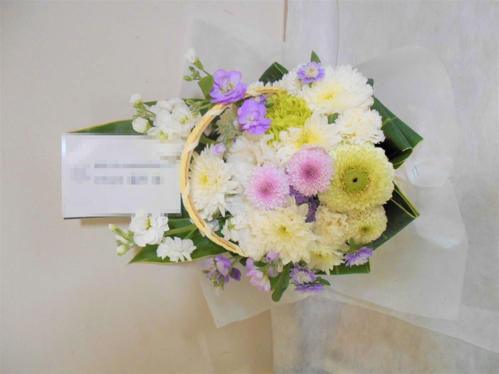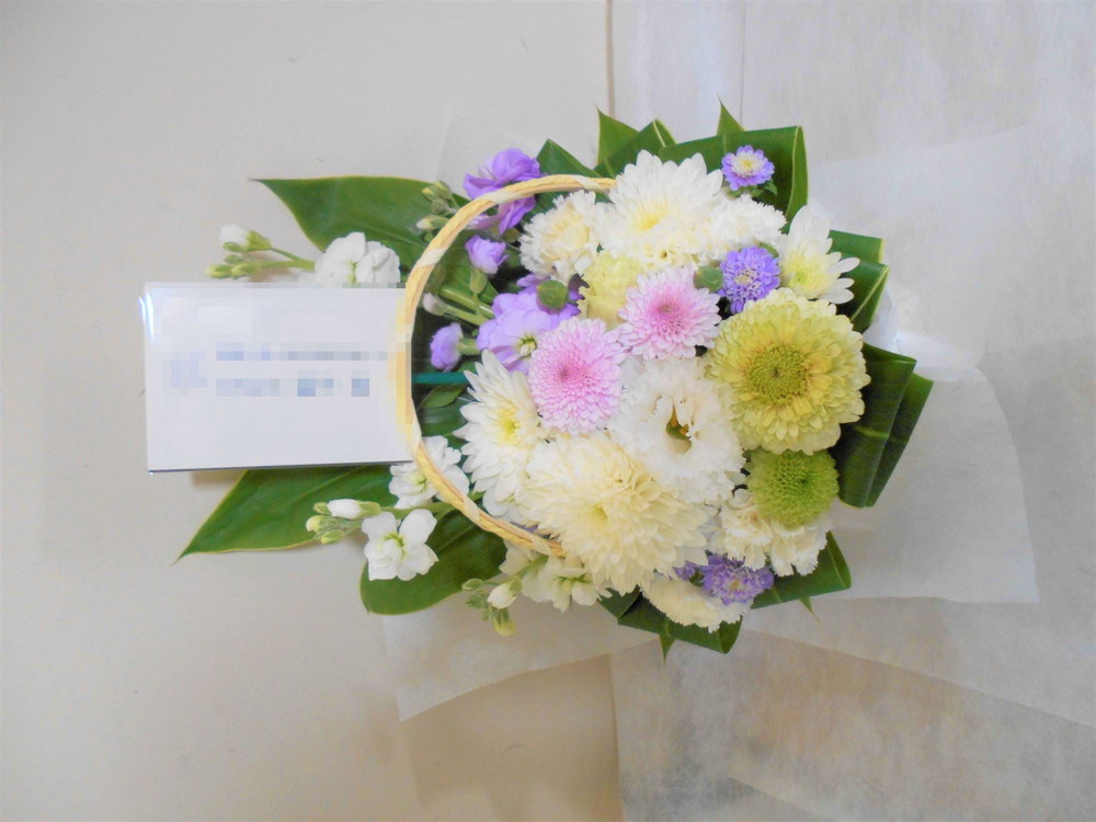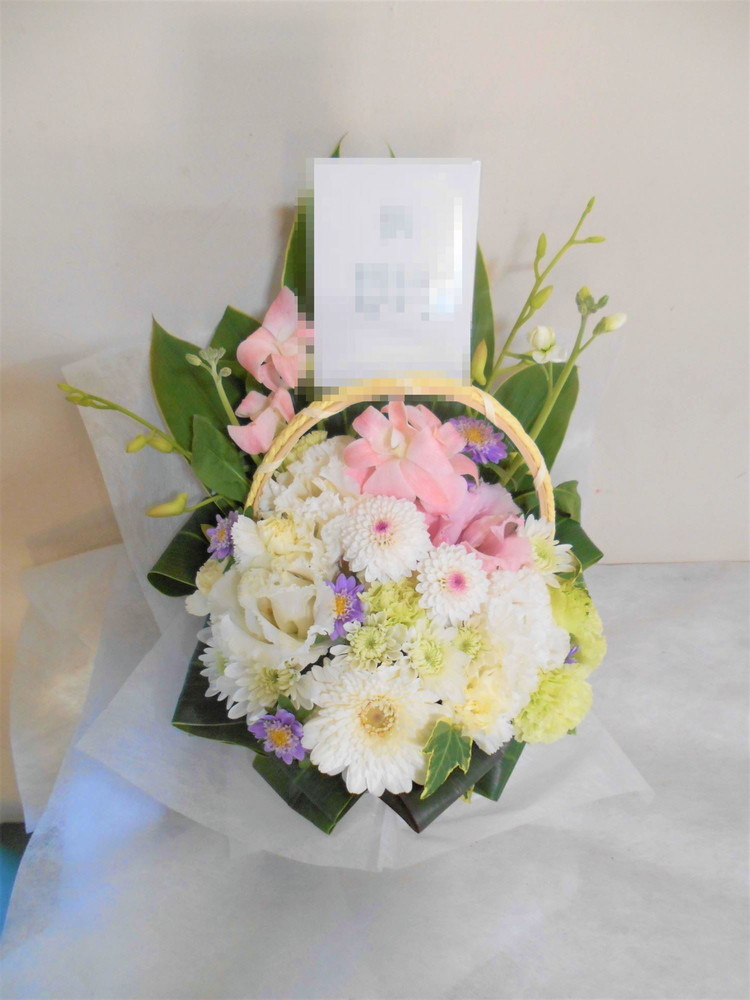 お悔やみ お供えの花 供花 (ホワイト&淡色カラーの手付きバスケットアレンジ)