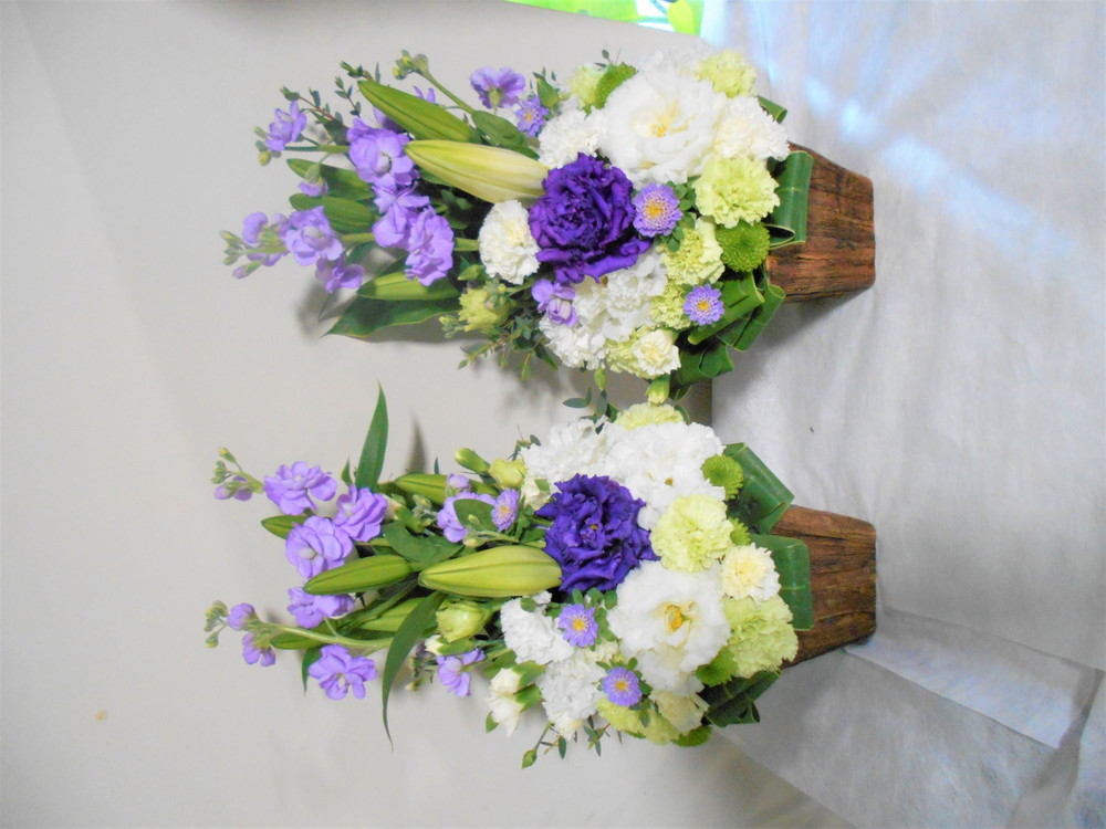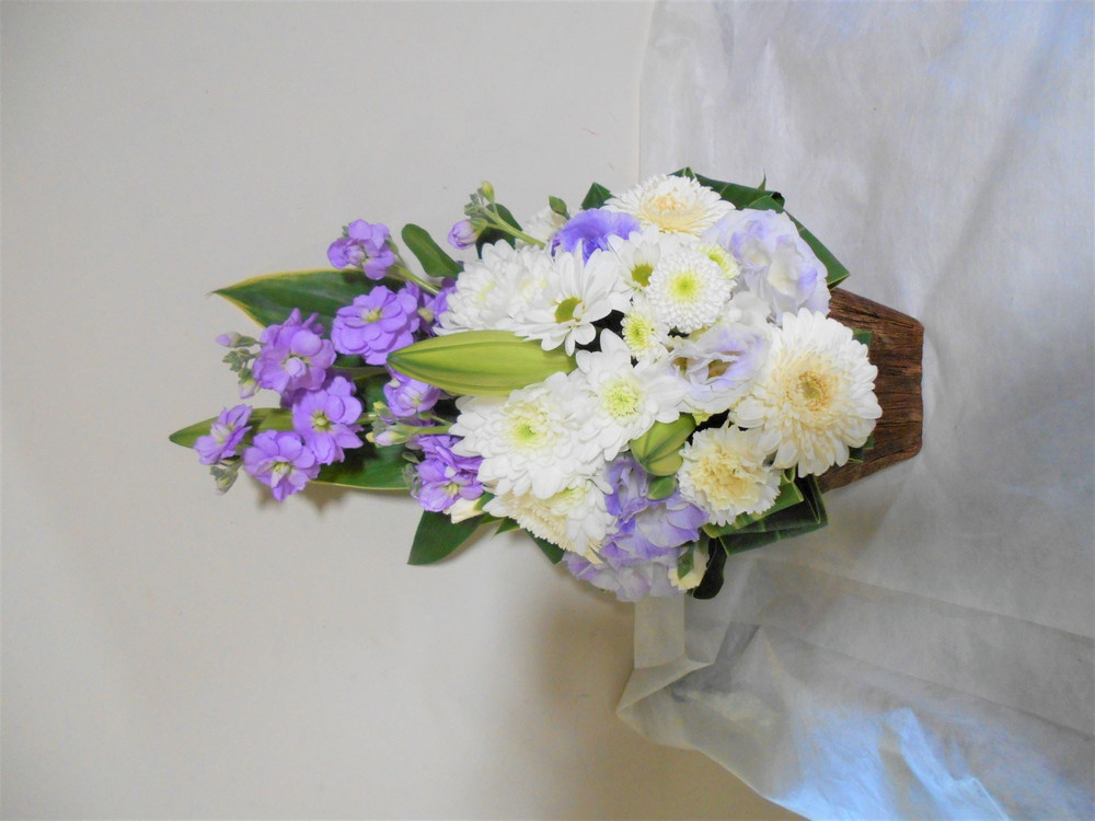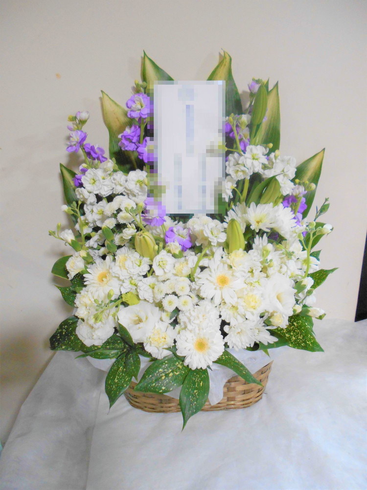 お悔やみ お供えの花 供花 (ホワイト&青・紫系カラーのお花でまとめたバスケットアレンジ)