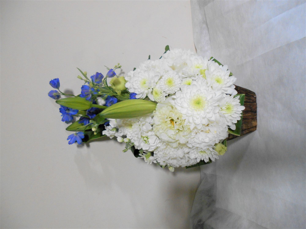 お悔やみ お供えの花 供花 (ホワイトにブルー系の挿し色を添えたバスケットアレンジ)