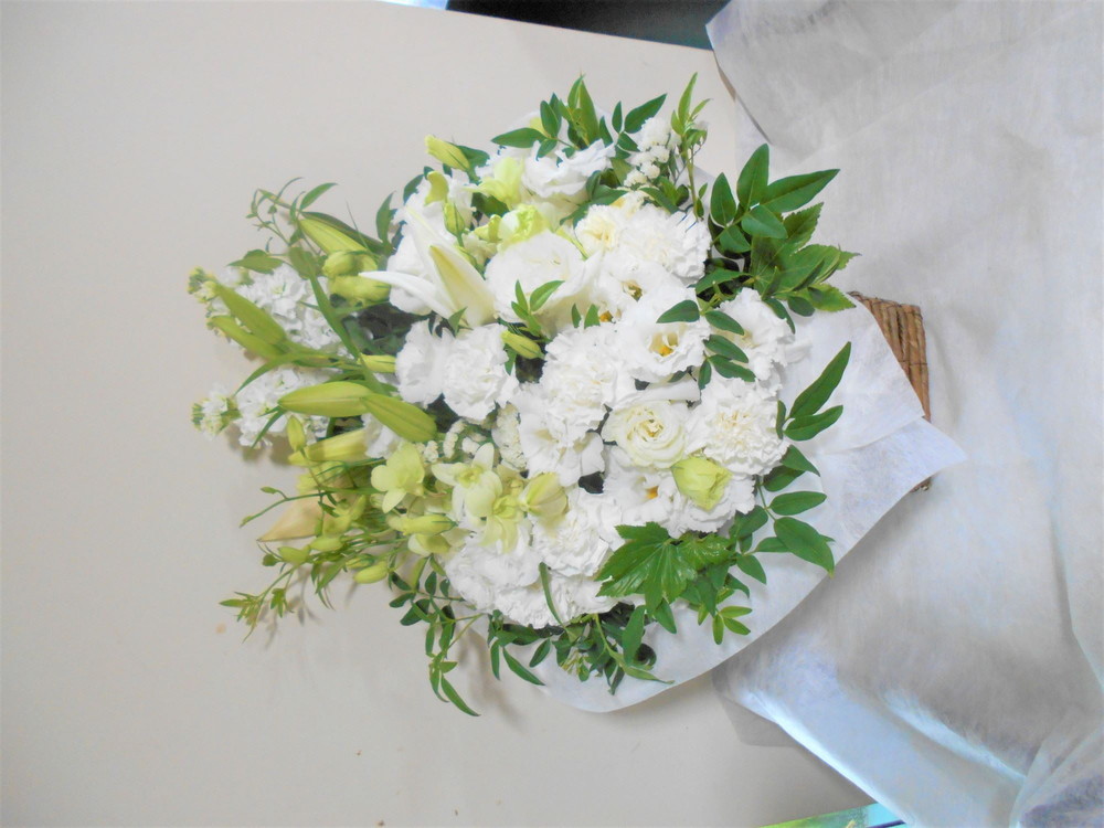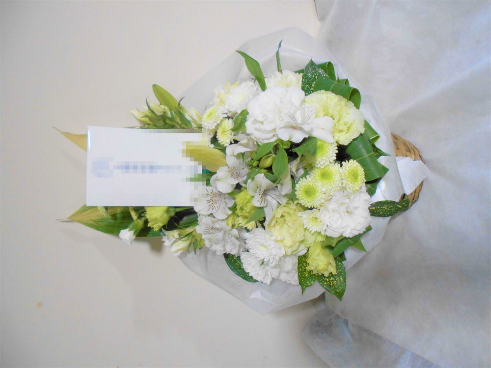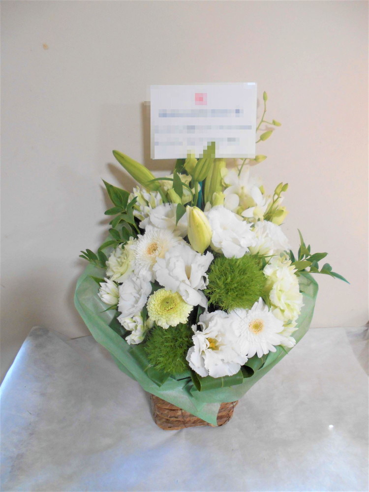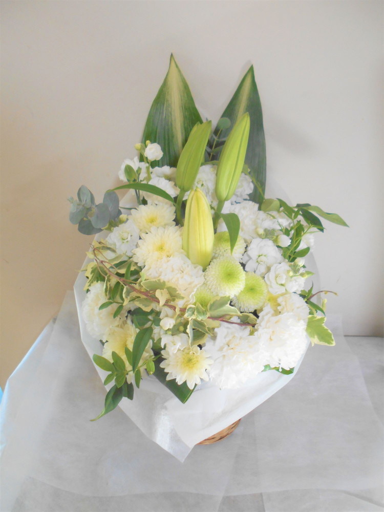 お悔やみ お供えの花 供花 (ホワイト&グリーンでまとめたバスケットアレンジ)