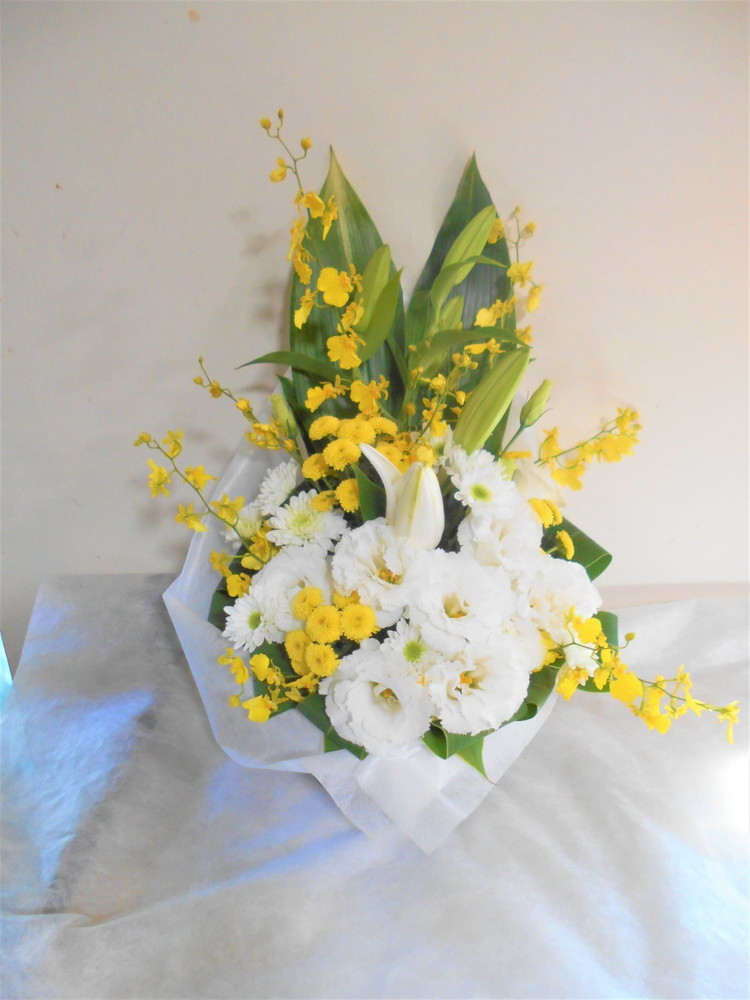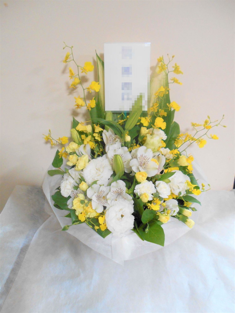 お悔やみ お供えの花 供花 (白ユリをメインに黄色の洋蘭をあしらったバスケットアレンジ)