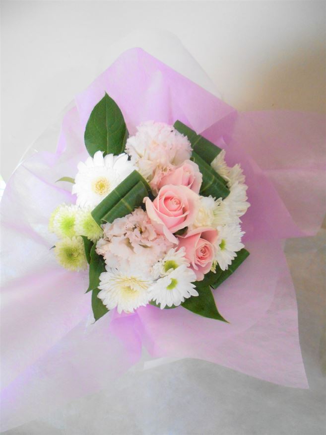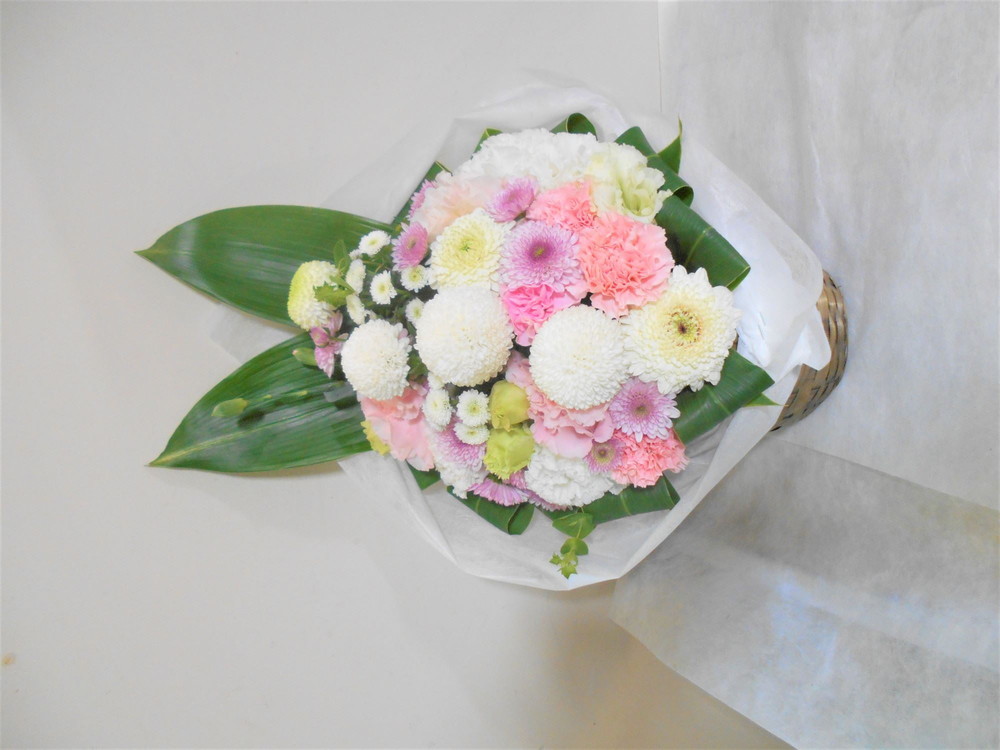【白系】お悔やみ お供えの花 供花 (ピンクのバラと白いお花でまとめた優しい花束)