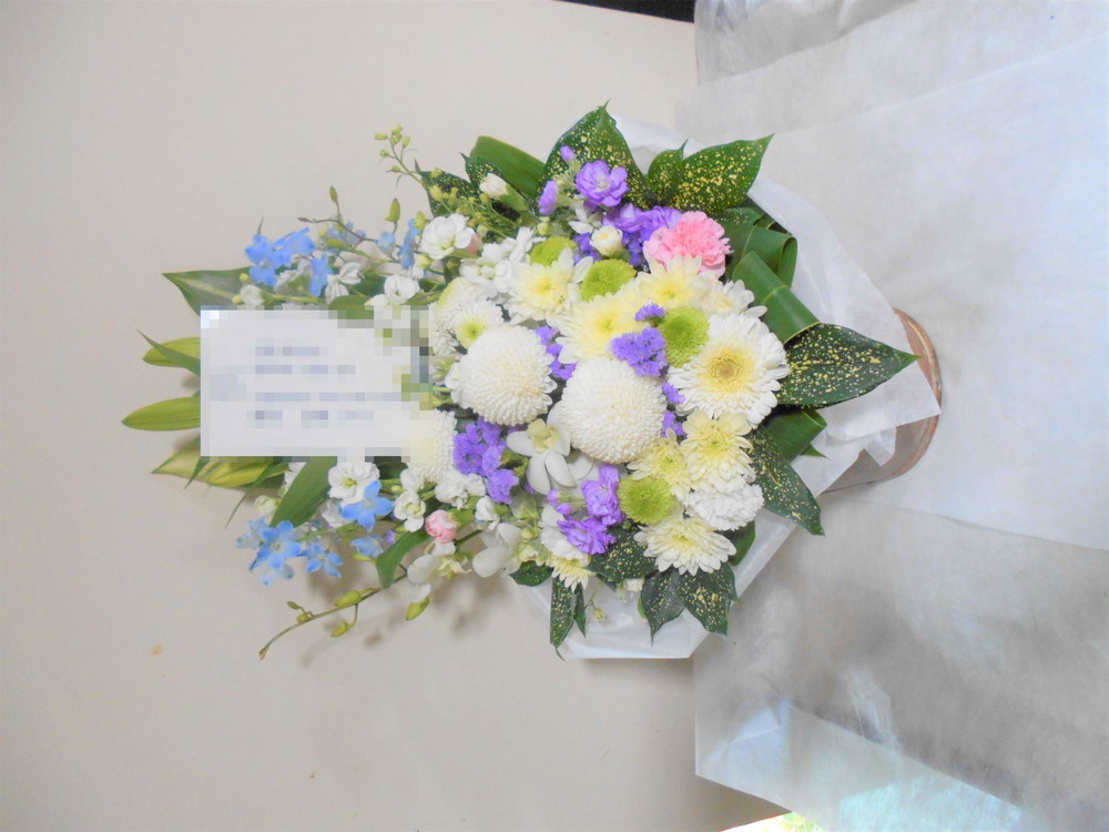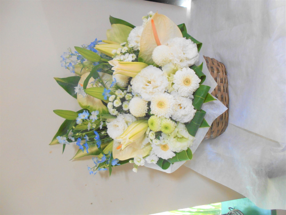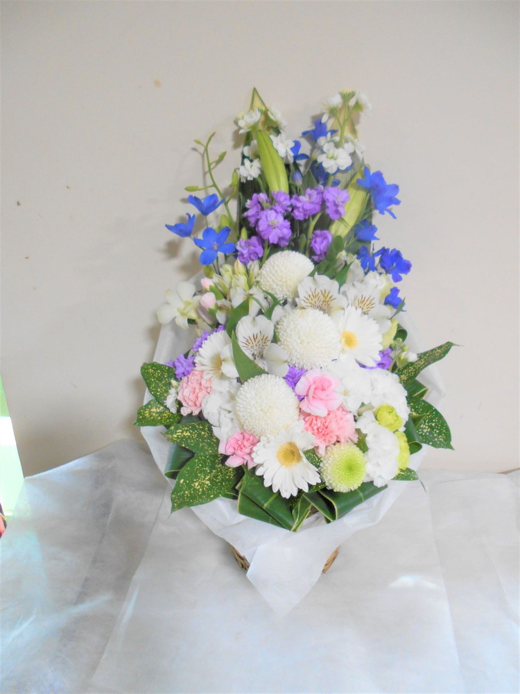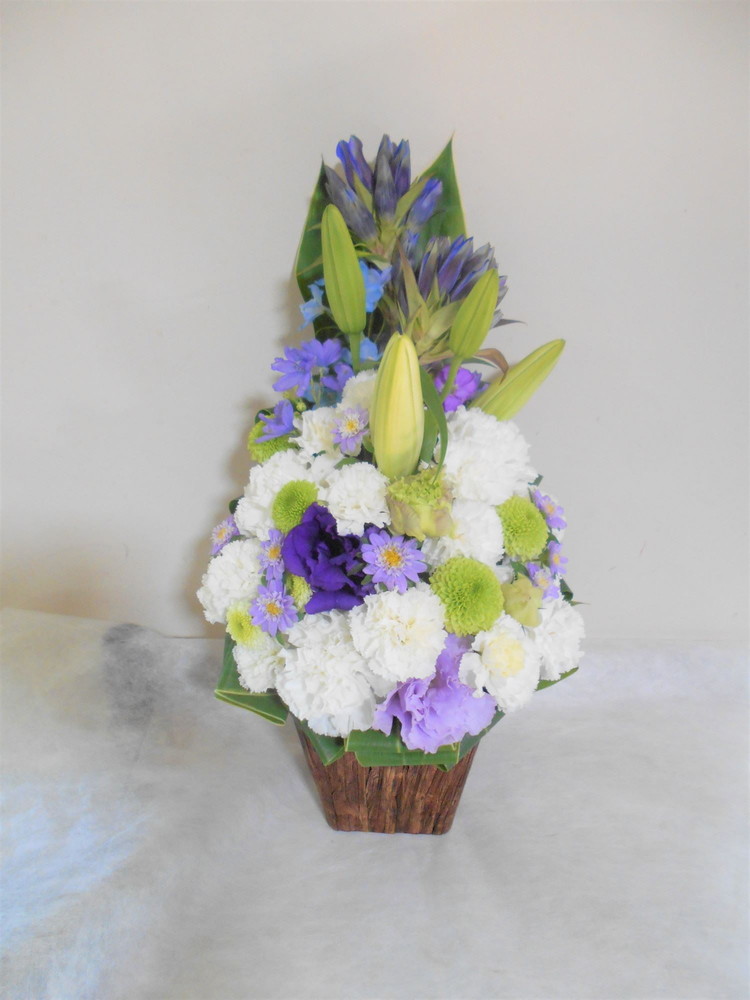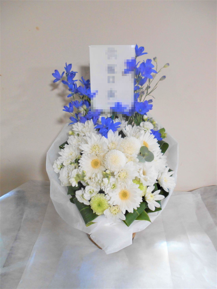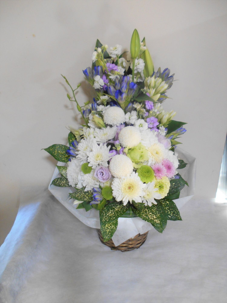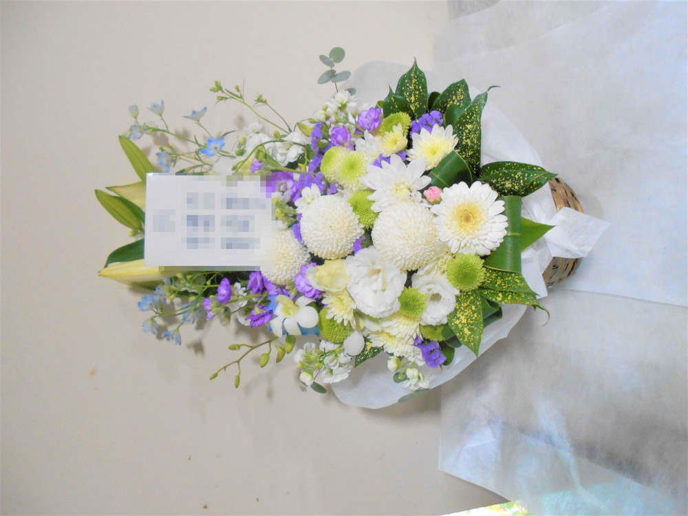 お悔やみ お供えの花 供花 (白基調に青系挿し色をそえたバスケットアレンジ)