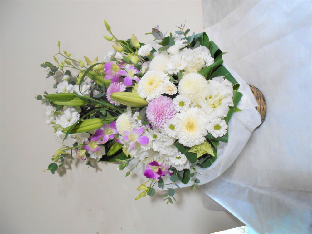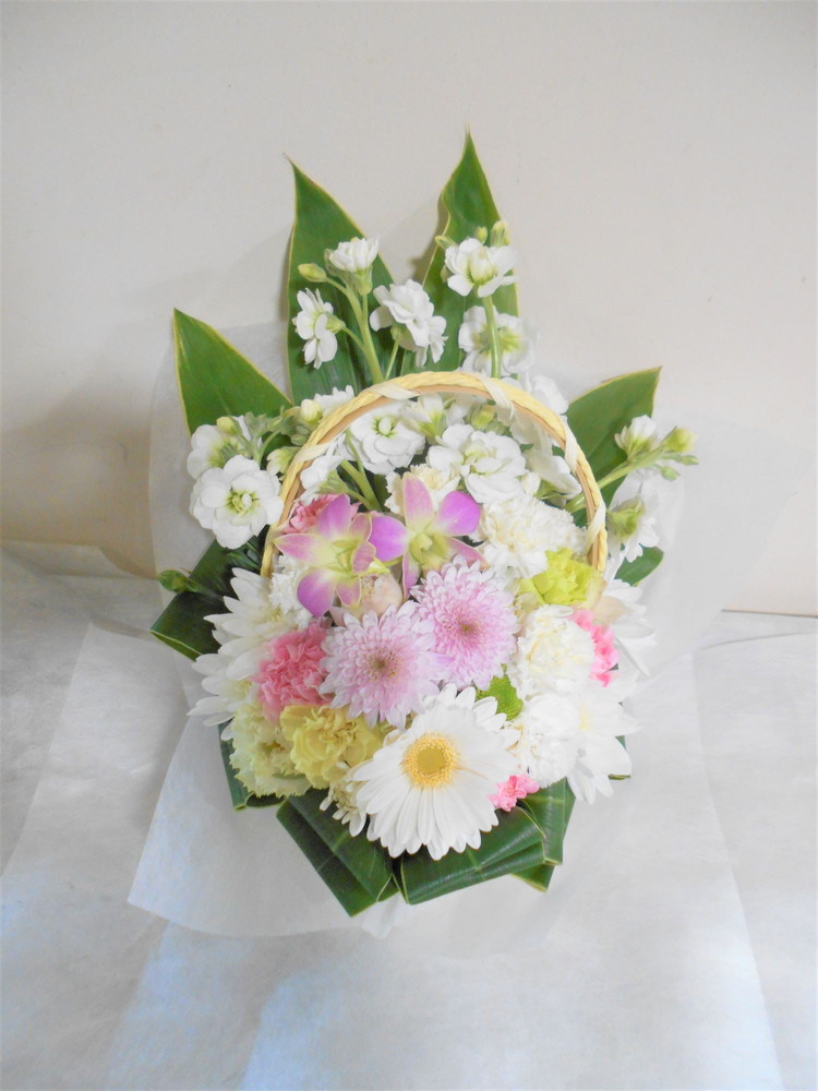 お悔やみ お供えの花 供花 (ホワイト&淡色カラーの手付きバスケットアレンジ)