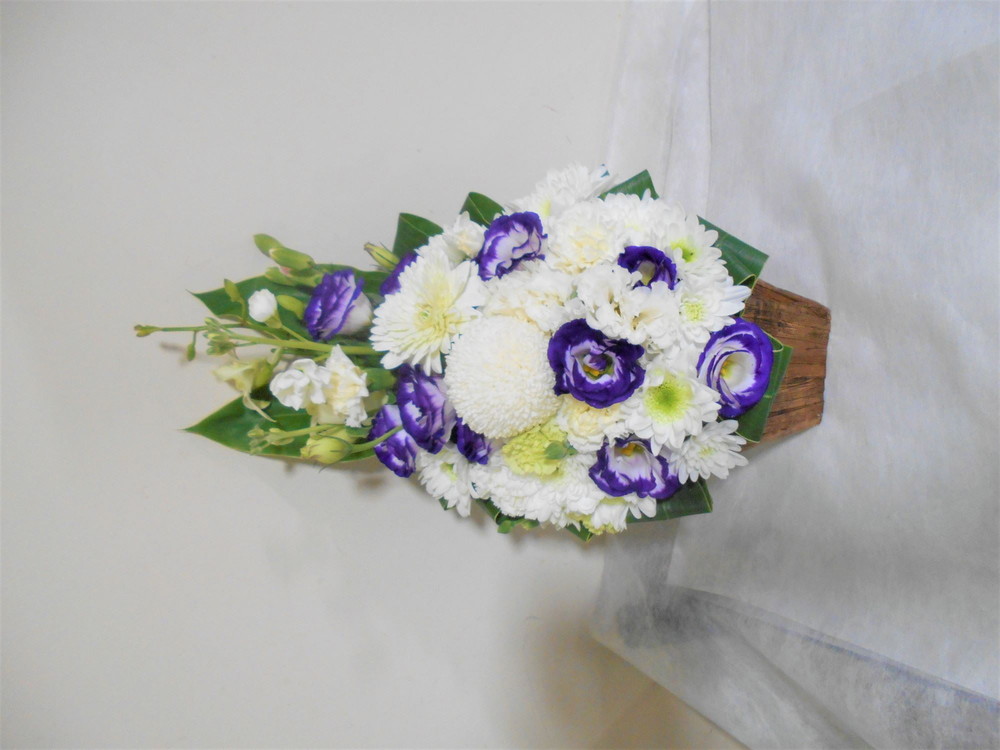お悔やみ お供えの花 供花 (ホワイト&青・紫系カラーのお花でまとめたバスケットアレンジ)