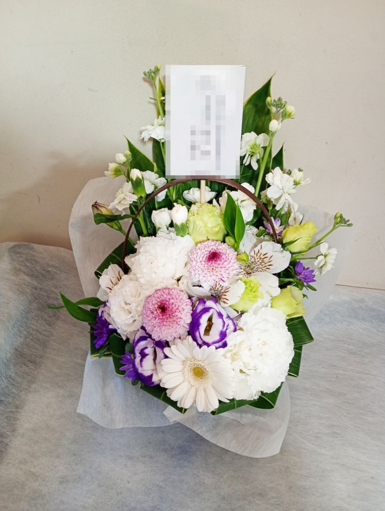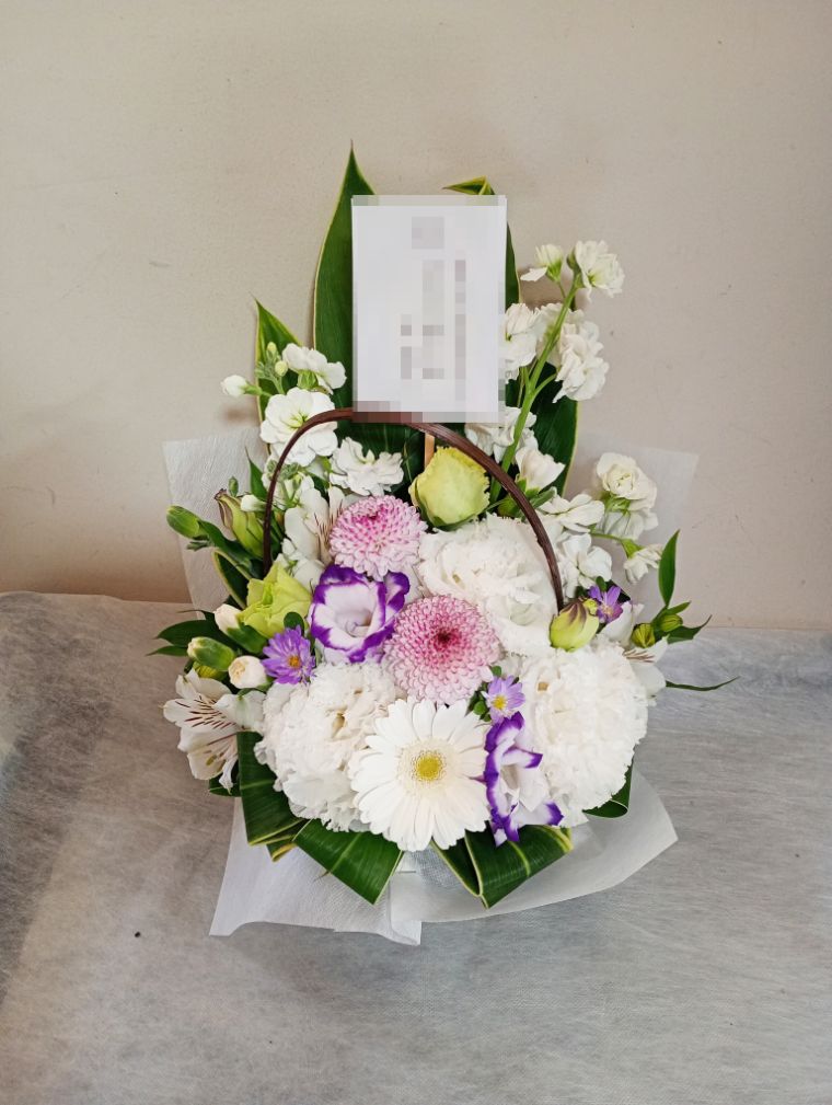お悔やみ お供えの花 供花 (ホワイト&淡色カラーの手付きバスケットアレンジ)