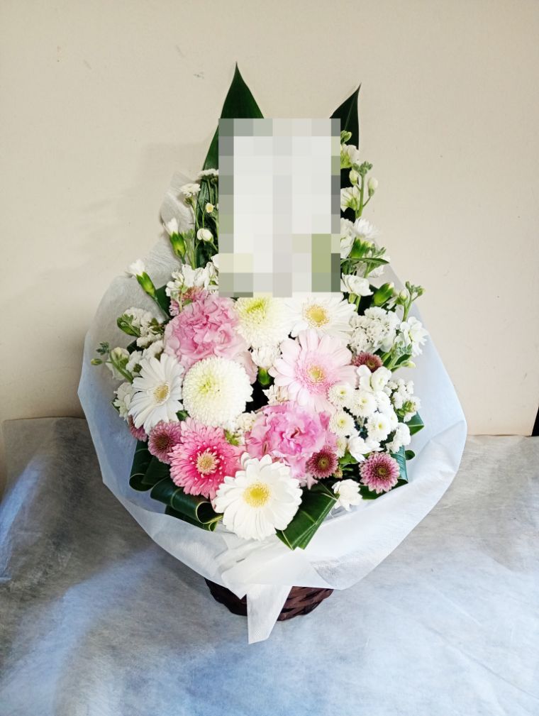 お悔やみ お供えの花 供花 (淡いピンク系のお花でまとめたバスケットアレンジ)