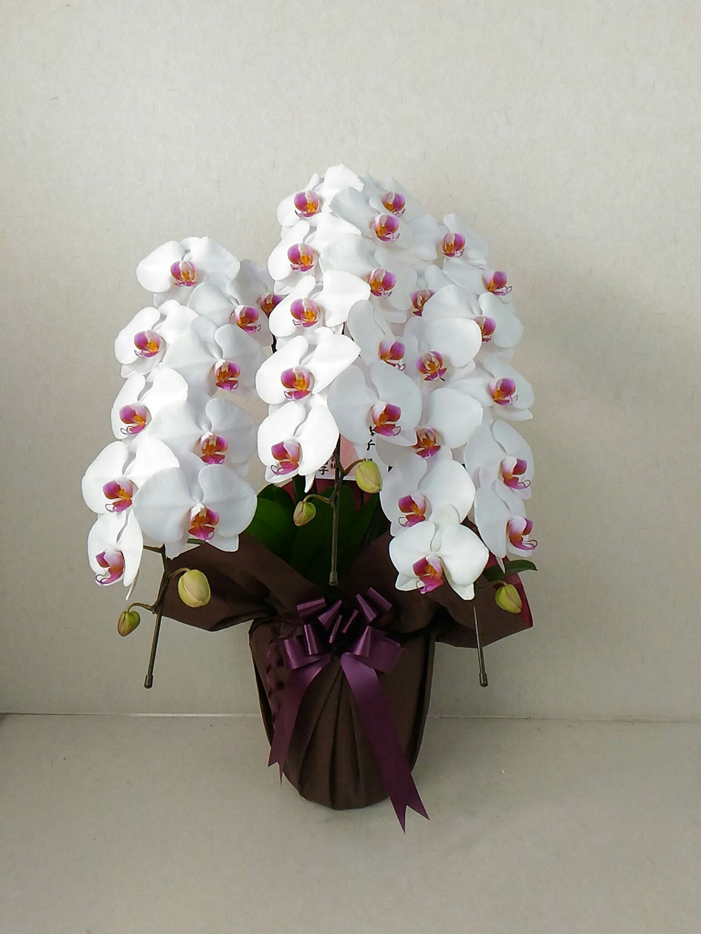胡蝶蘭の実際にお届けした写真です。花秘書では発送前に写真をメールで送信致しますので安心して大切な顧客や取引様へのギフトにご利用頂けます。