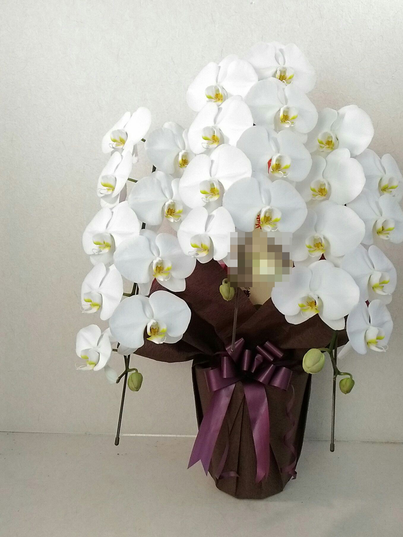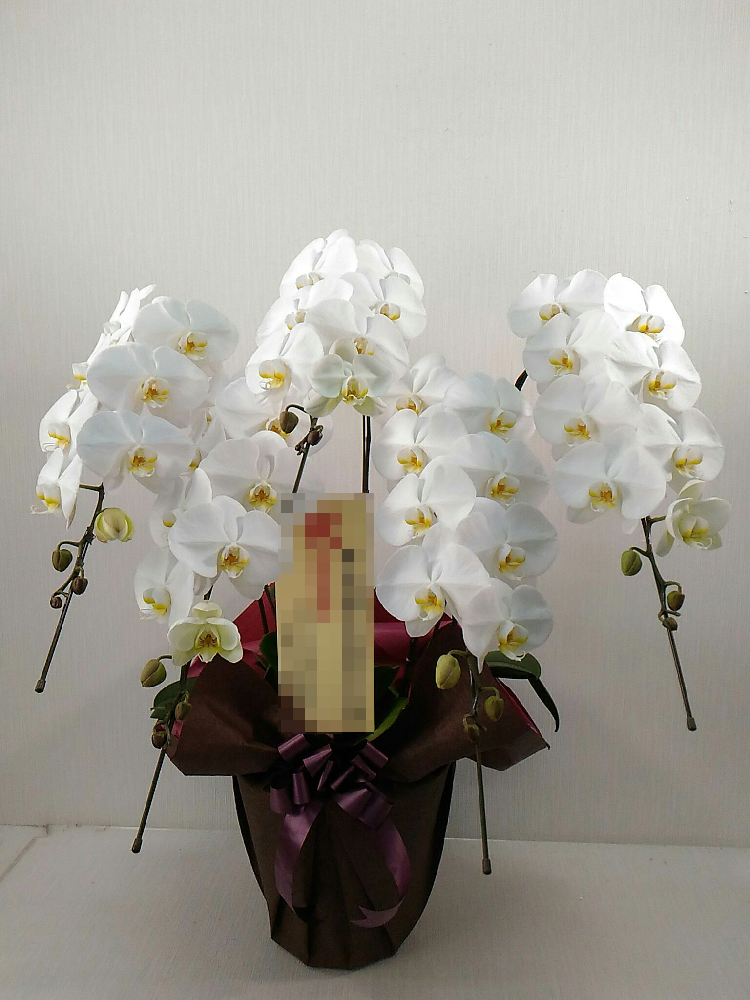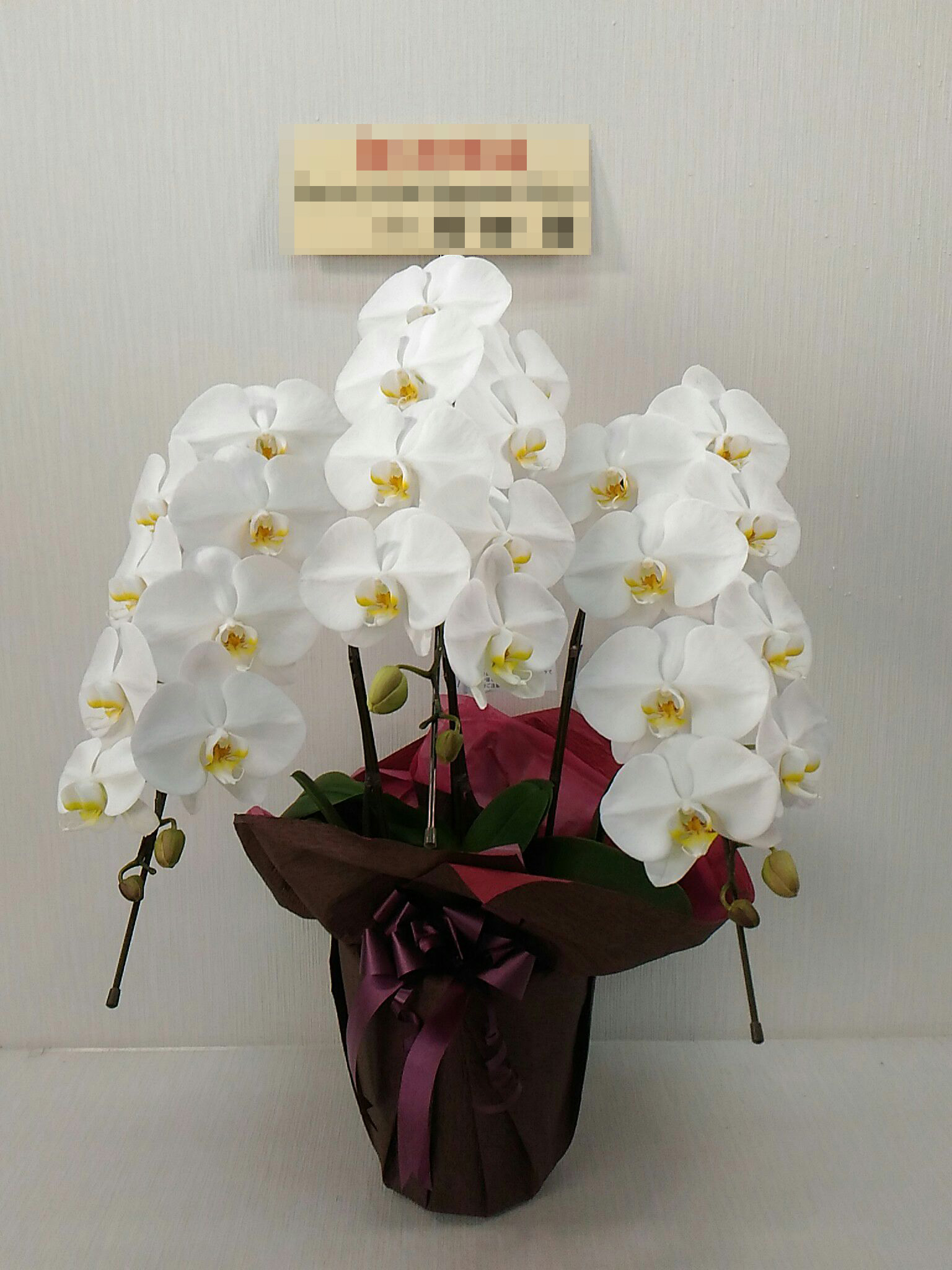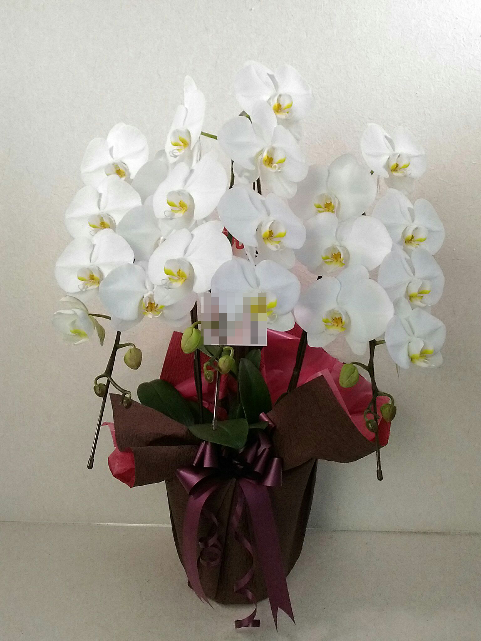 胡蝶蘭の実際にお届けした写真です。花秘書では発送前に写真をメールで送信致しますので安心して大切な顧客や取引様へのギフトにご利用頂けます。