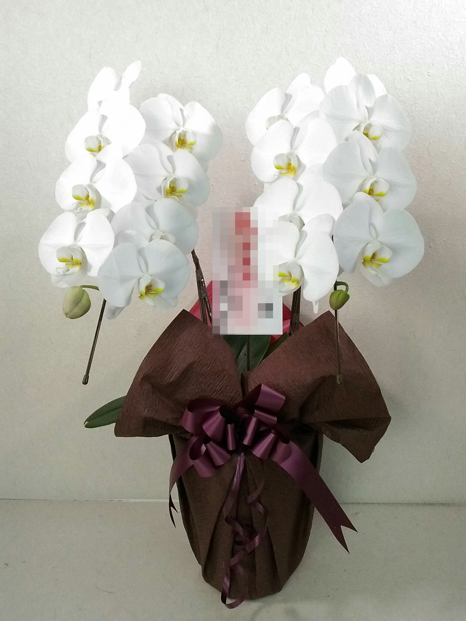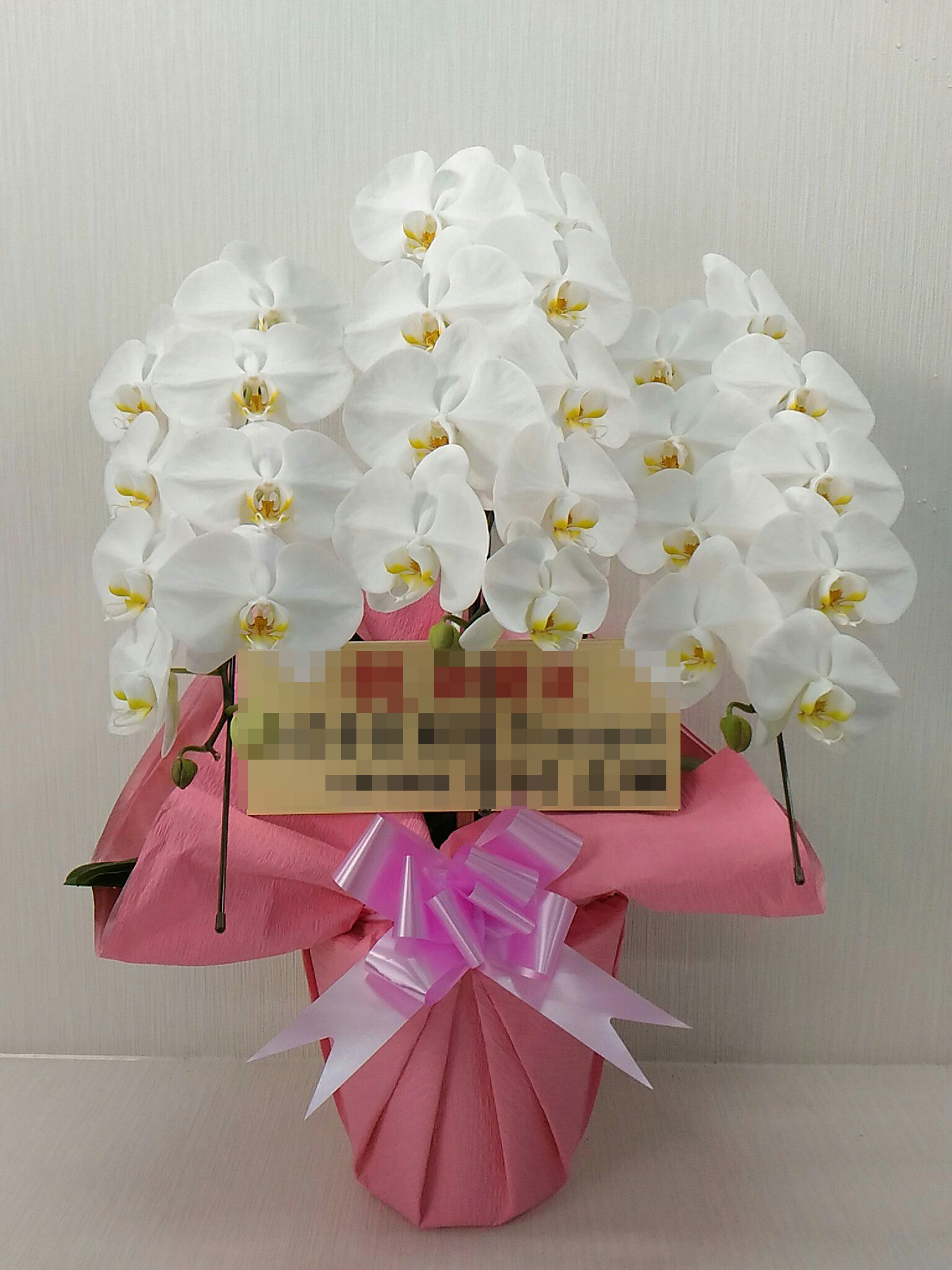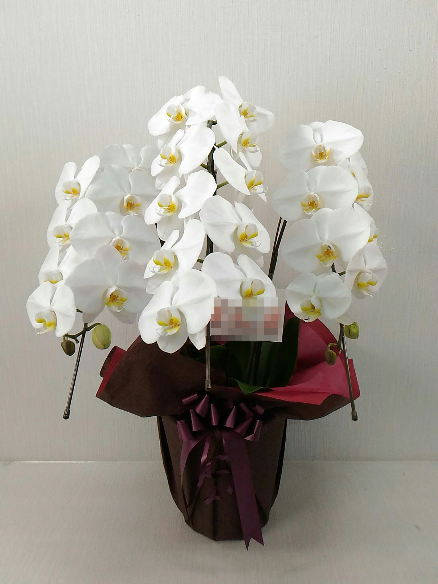 胡蝶蘭の実際にお届けした写真です。花秘書では発送前に写真をメールで送信致しますので安心して大切な顧客や取引様へのギフトにご利用頂けます。